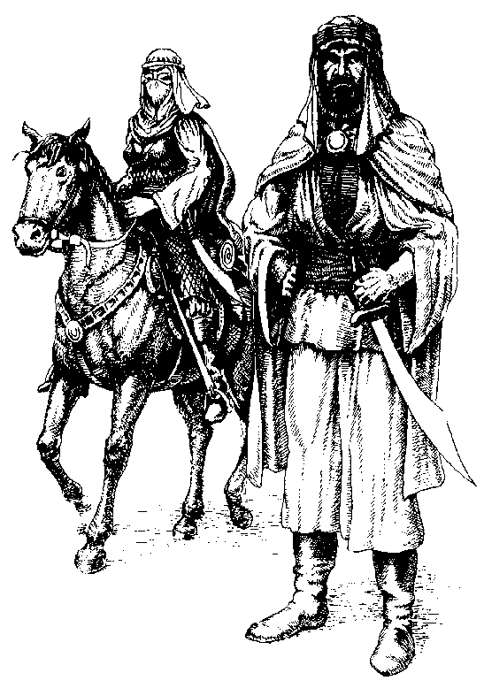 The Novadi think of themselves as the "chosen ones", since Rastullah himself, the one and only god, spoke to them and gave them 99 rules as a gift. This is the main source of the very sensitive pride. 99 rules are a lot because they require something of a believer in every situation of life and some of these rules do not even fit each other: rule 36: "The god pleasing one applies himself to gentleness on each of the nine days of all the moons of the gods throughout the run of the sun of Rastullah." rule 41: "The god pleasing one does not hide his fury, whenever his pride is hurt, poisoned or made doubtful."The role of the NovadiThere are many reasons for a Novadi to leave home. Maybe his father send him to strife the shores of Arkania as an adventurer and learner, his curiosity might have come through or the oasis came to be a little to narrow, maybe he even was captured in the last war against the dark Tar Honak and dragged to Al'Anfa. A Novadi woman who is not one of the fighters or revengers as said before might leave home because she wants to escape inequality, avoid a marriage or for similar reasons.Whatever the gender of your hero, she will never loose four distinct features even when he left home years ago: a flowery speech, riding art in perfection, a hardly controllable temper and unbroken pride. A Novadi may be a reliable part of an adventurers' group, but hurt him in his pride and you got problems. This may happen when somebody insults his horse or only a wondering stare of a citizen, which he may recognize as a provocation and you will see how fast a Novadi takes a blade into his hand. Additionally, each Novadi is very religious and he tries to pursue all 99 rules, which is a hard task (very complicated are the eating rules and those could easily evolve as a problem in any tavern outside the south of the continent). A discussion about faith may well end up as a fight. Quotes"By the curly hair of Rastullah...""You, grandchild of brazenness - the Lord give me the gift of forbearance and you the gift of an early and painful death..." "I have sinned and I ask for salvation." "Your lips are more tender than the nostrils of my Shadif, you, flower of the Wadi Djenna, and whiter ere they than fresh cheese and your body is softer than a ripe fig..." |